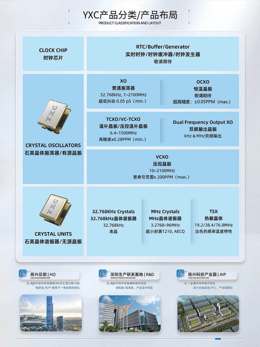 揚(yáng)興科技(YXC)深耕晶振行業(yè)37年,目前擁有先進(jìn)的測(cè)試儀器和經(jīng)驗(yàn)豐富的銷售技術(shù)團(tuán)隊(duì),主營(yíng)產(chǎn)品系列包括:可編程晶振、石英振蕩器、石英晶體諧振器、時(shí)鐘晶振、陶瓷諧振器、TCXO溫補(bǔ)晶振、濾波器等。