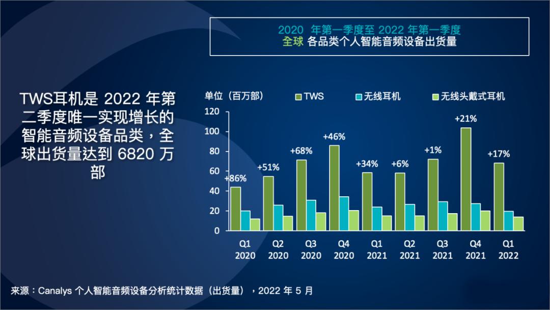 據(jù)canalys數(shù)據(jù)顯示,2022年Q1全球的無線耳機(jī)出貨量為6820萬部,同比增長17%,全球音頻產(chǎn)業(yè)的“無線化”發(fā)展趨勢明顯。一副耳機(jī)需要兩顆晶振,藍(lán)牙耳機(jī)市場逐步放量將會帶動晶振需求增長。