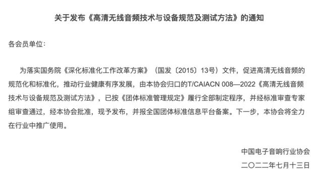 近日,中國電子音響行業(yè)協(xié)會正式發(fā)布HWA標(biāo)準(zhǔn)即《高清無線音頻 技術(shù)與設(shè)備規(guī)范及測試方法》。針對消費(fèi)者對無線音頻音質(zhì)、連接、功耗、降噪等聽音體驗(yàn)制定明確標(biāo)準(zhǔn),將讓高清無線音頻體驗(yàn)走近更多消費(fèi)者,持續(xù)促進(jìn)音頻產(chǎn)業(yè)發(fā)展。