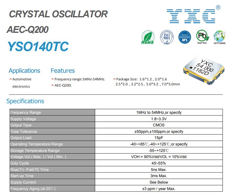 YSO140TC車規(guī)晶振,通過AEC-Q200/TS16949認證,工作溫度范圍為-40~+125℃,1-54Mhz頻率范圍,可兼容多個電壓(1.8-3.3V),超薄晶體,最小體積可做到1612,廣泛應用于GPS導航、汽車中控屏、車載攝像頭等。