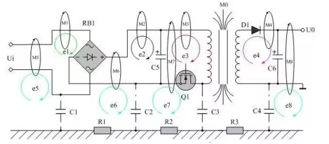 圖中e1、e2、e3、e4為磁場對回路感應產(chǎn)生的差模干擾信號;e5、e6、e7、e8為磁場對地回路感應產(chǎn)生的共模干擾信號。共模信號的一端是整個線路板,另一端是大地。