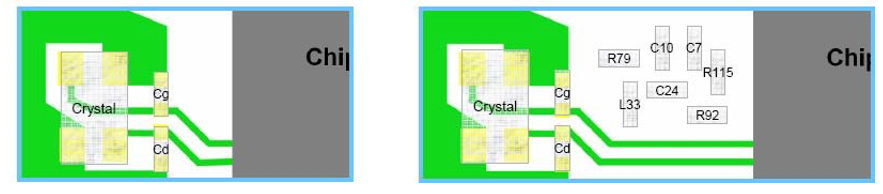 由于晶振為干擾源,本體下方所有層原則上不準(zhǔn)許走線,特別是關(guān)鍵信號(hào)線,要保證晶振周圍的沒有其他元件,防止器件之間的互相干擾,影響時(shí)鐘和其他信號(hào)的質(zhì)量。若濾波器器件放在晶振下方,且濾波電容與匹配電阻未按照信號(hào)流向排布,會(huì)使濾波器的濾波效果變差。