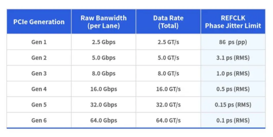 隨著PCIe版本的升級,參考時鐘的性能要求也大幅提高,下表展示了不同PCIe協(xié)議版本對于參考時鐘RMS抖動的要求: